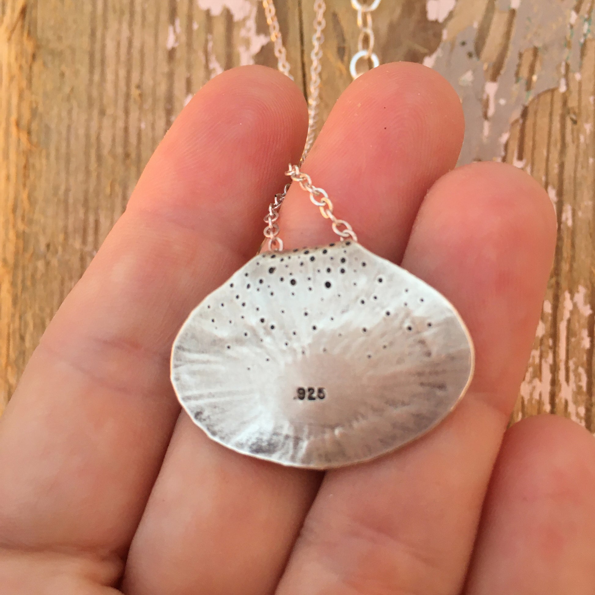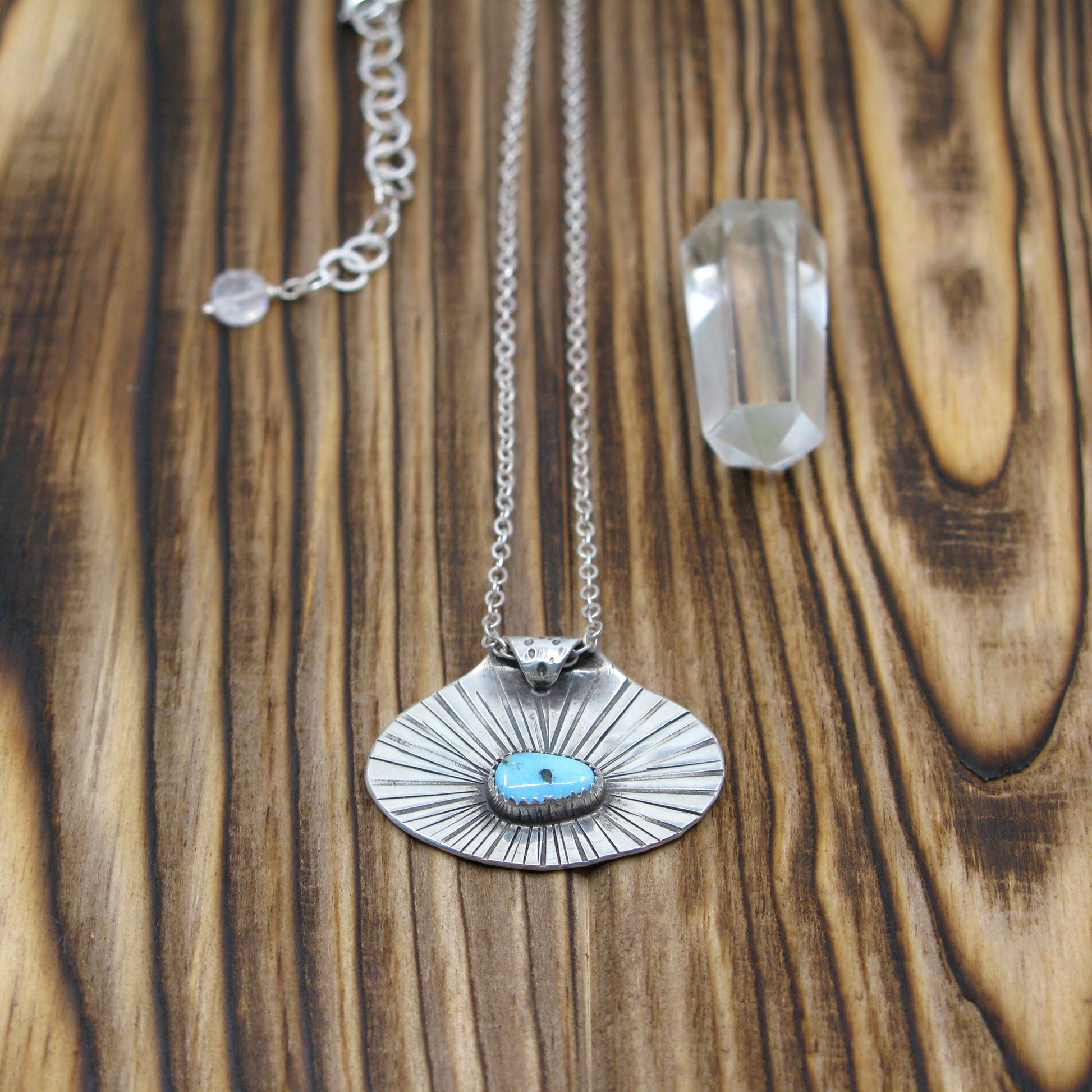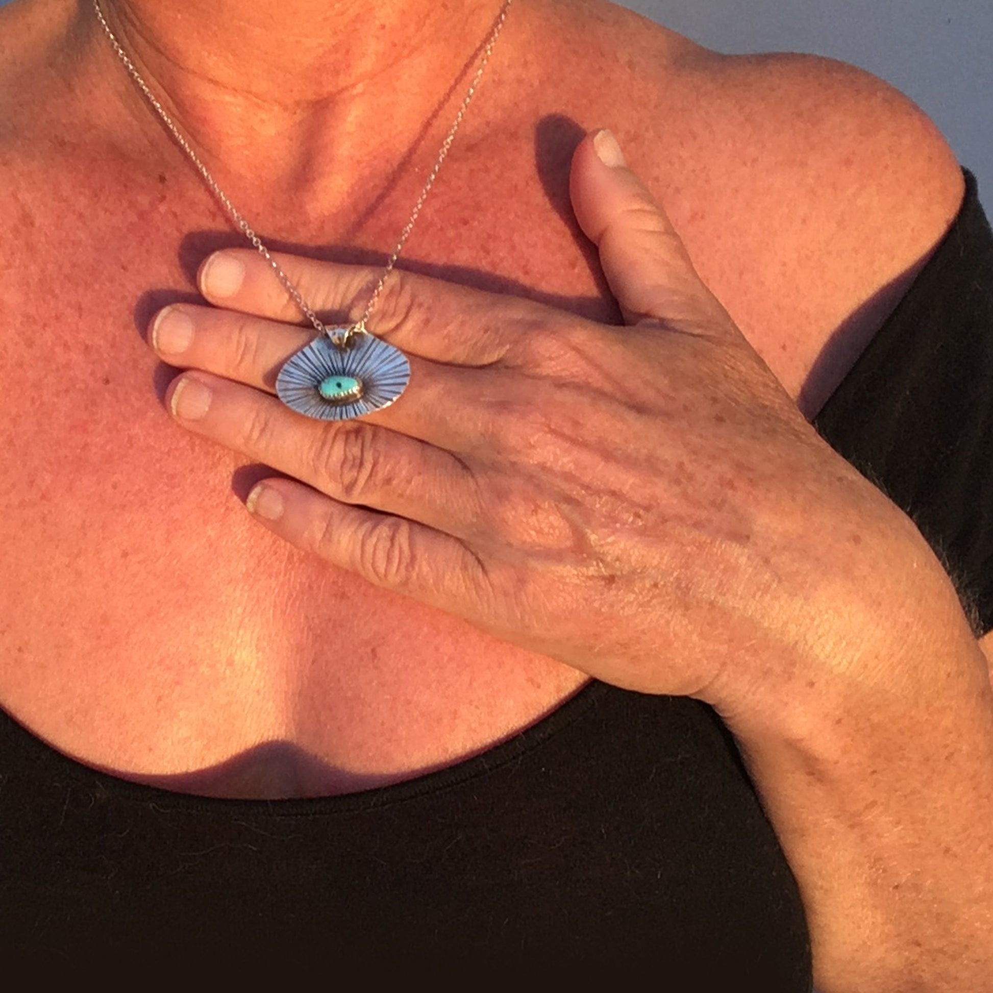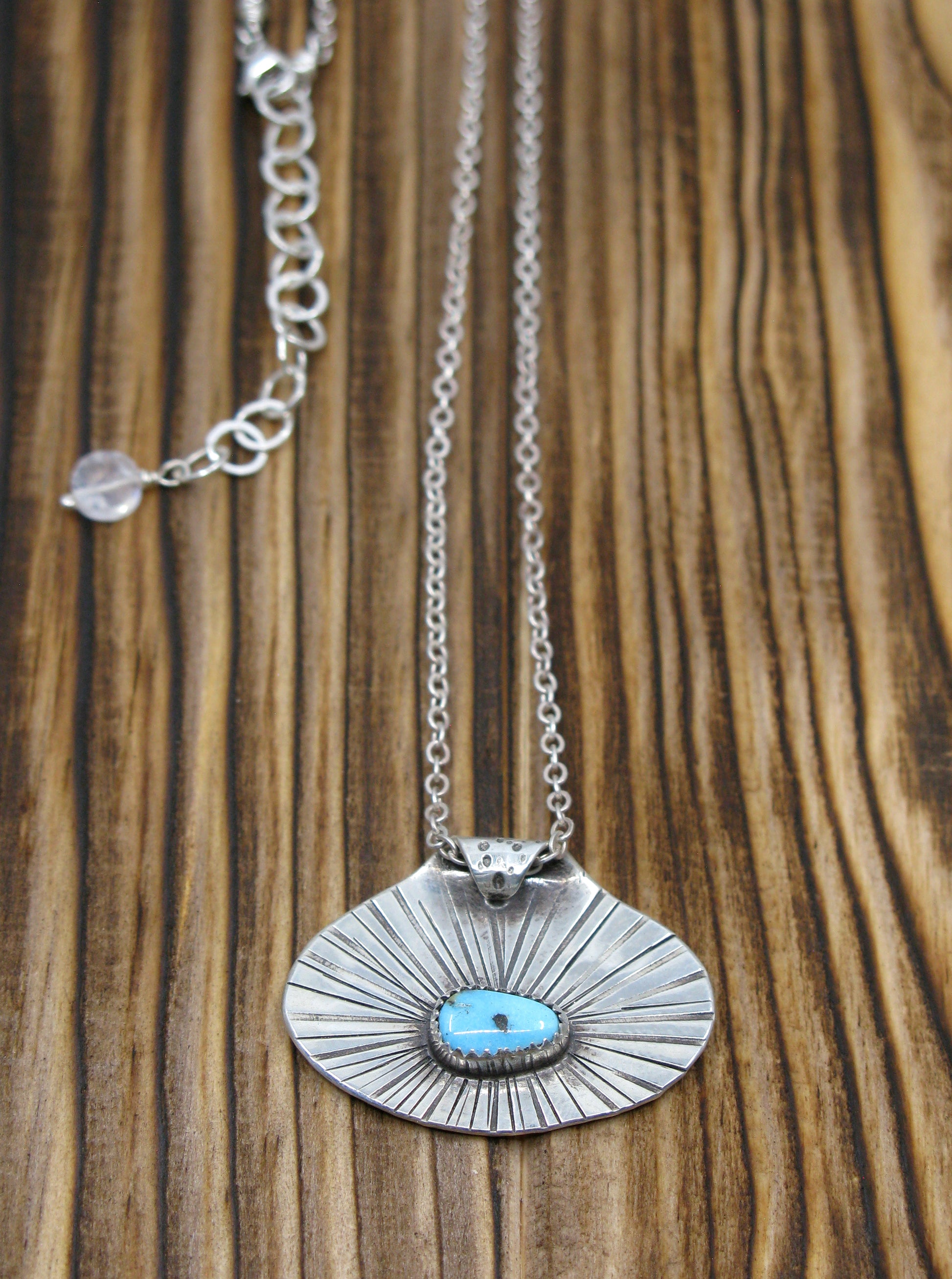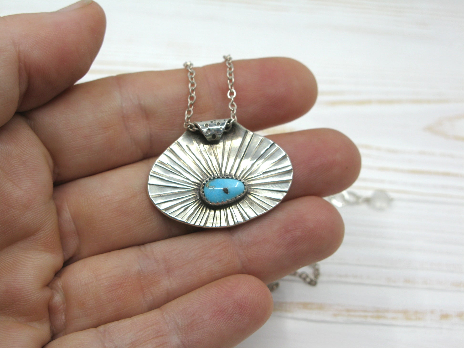 Artfully smithed with natural Blue Ridge Turquoise, sterling silver, fine silver and a bit of magical rainbow moonstone. Stamped and chased with texture of rays and seaspray that continues onto the backside of the pendant. Patina has been applied to accentuate the textures.