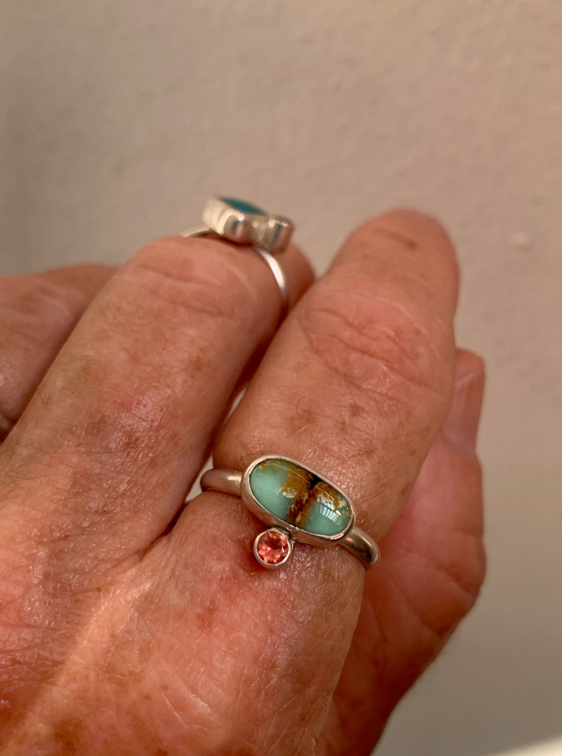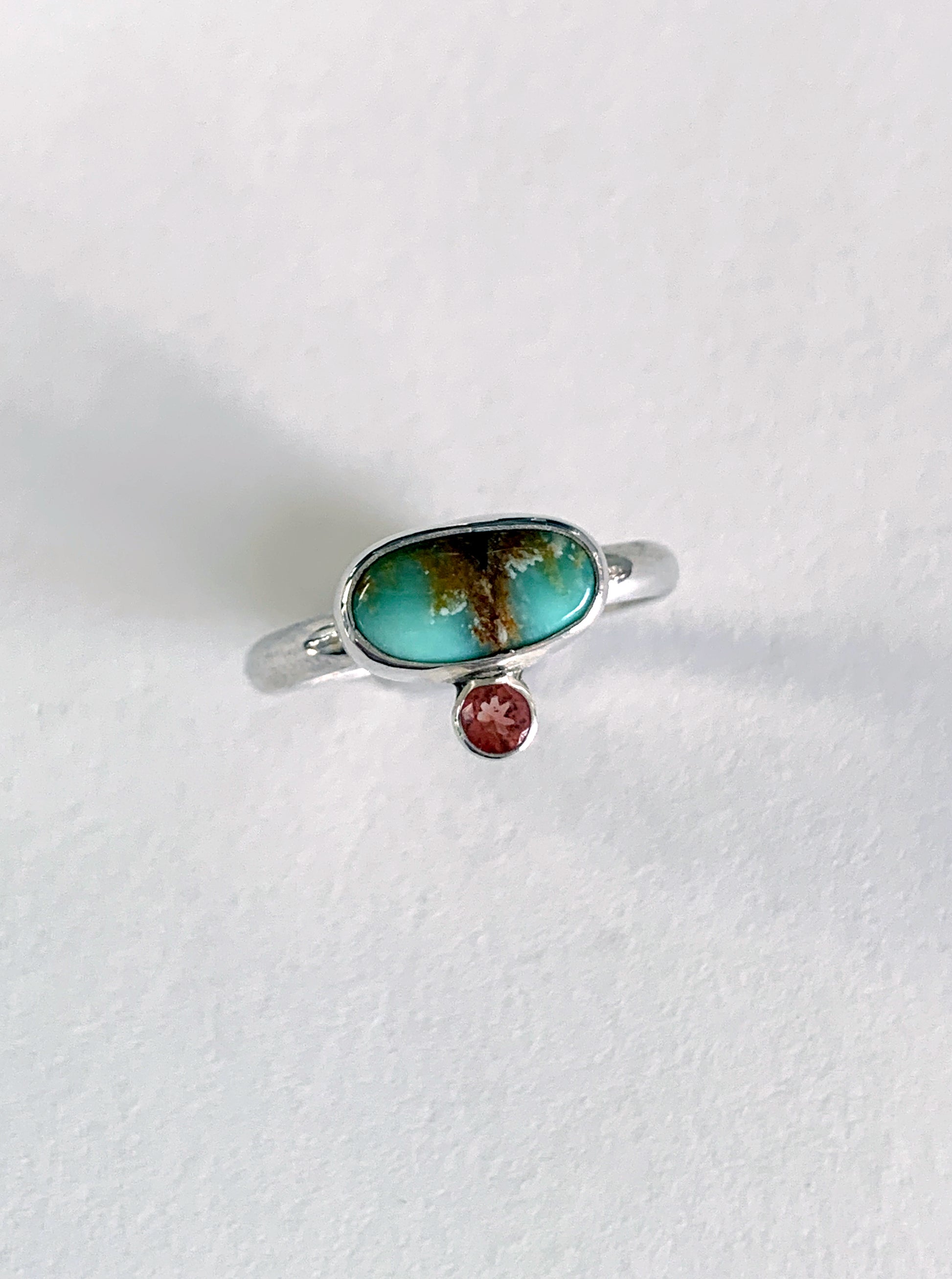 Hand fabricated, two stone, petite statement ring featuring a American-mined New Lander county Variscite cabochon paired with a shimmering, faceted Oregon Sunstone.