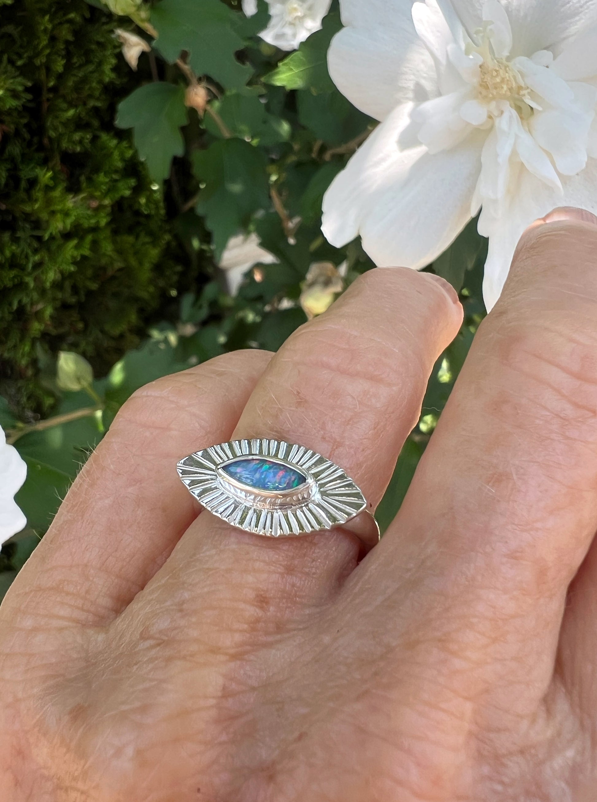 A beautiful, vibrant, natural Australian opal is set in upon an eye shaped, hand stamped backplate of thick sterling silver.