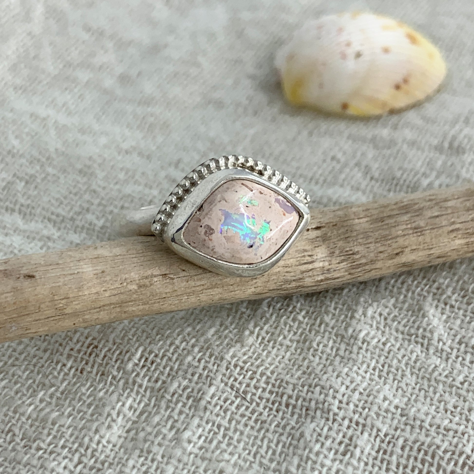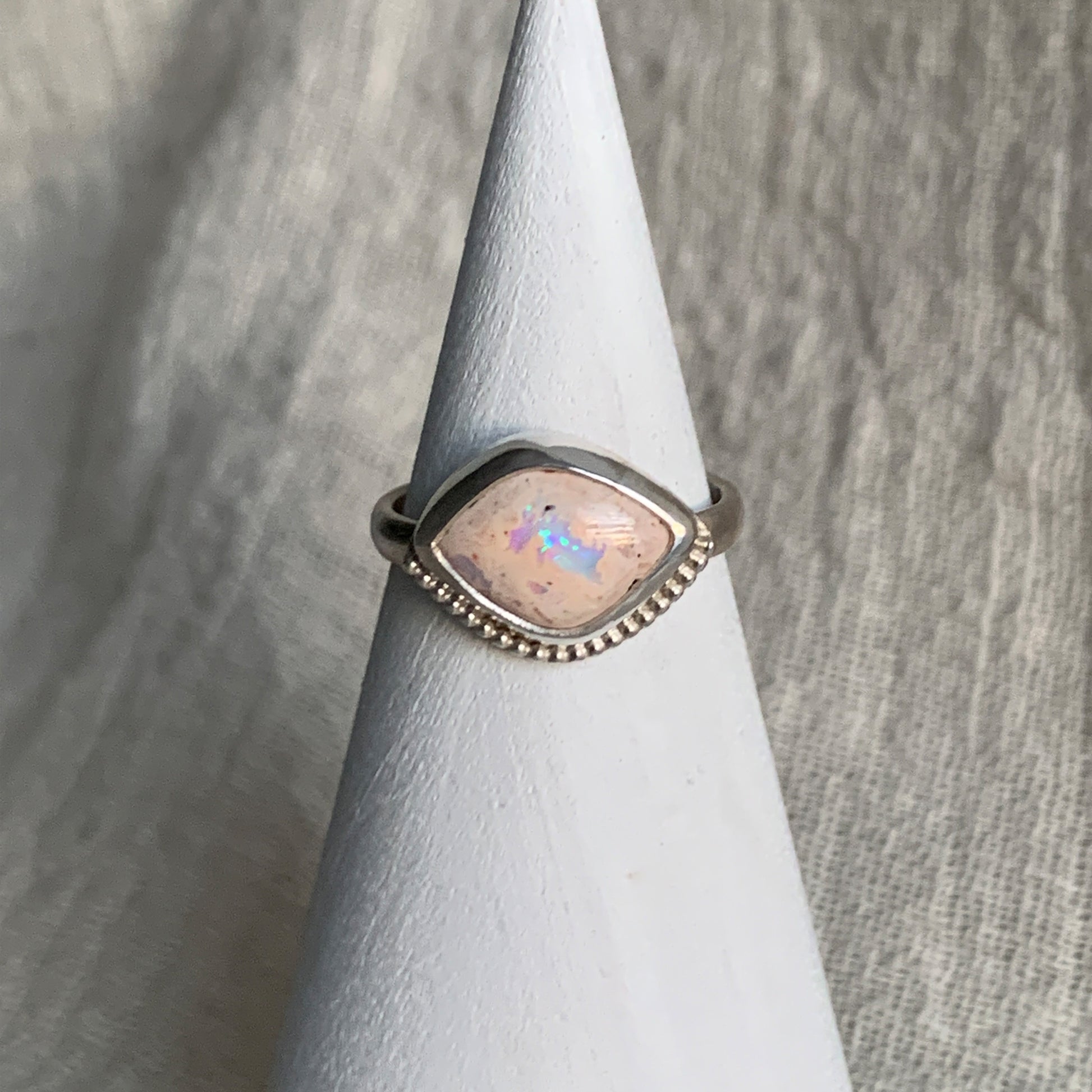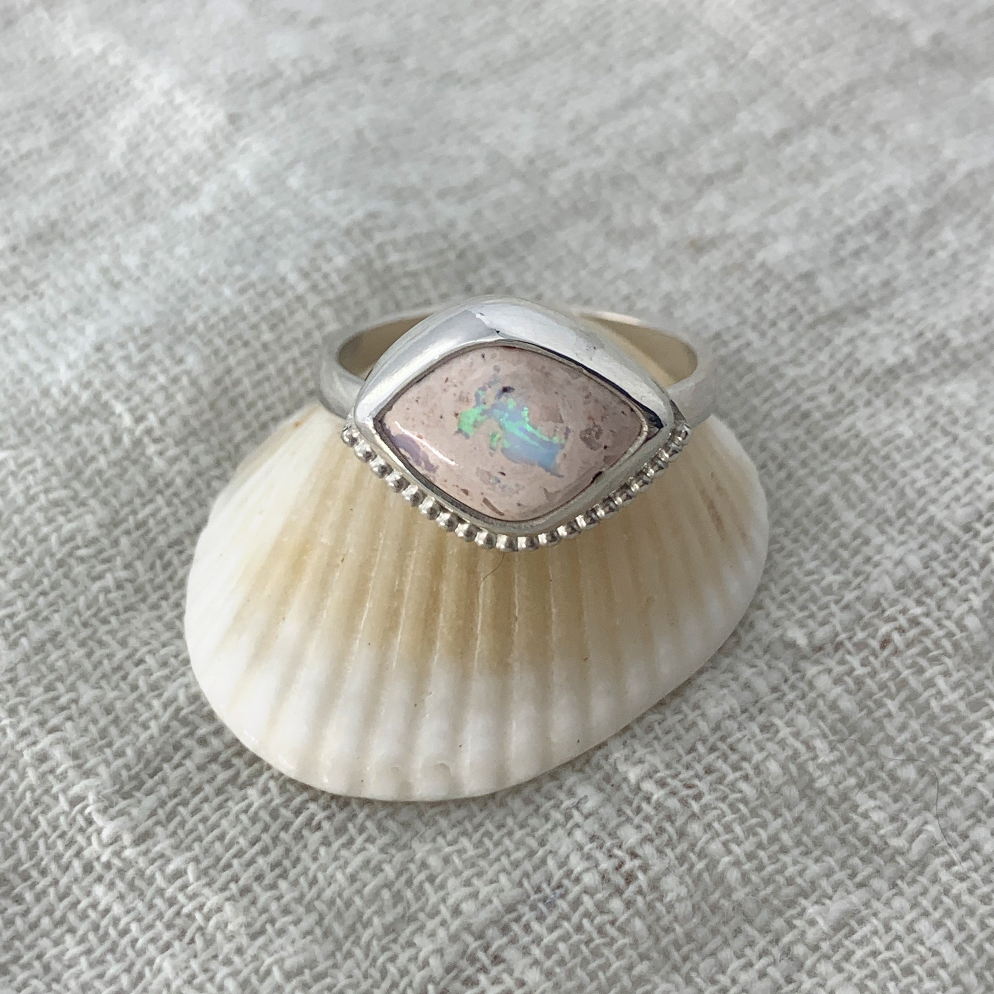 Hand fabricated, ring featuring a beautiful Mexican Opal. A beaded silver border detail lines one edge of the stone.