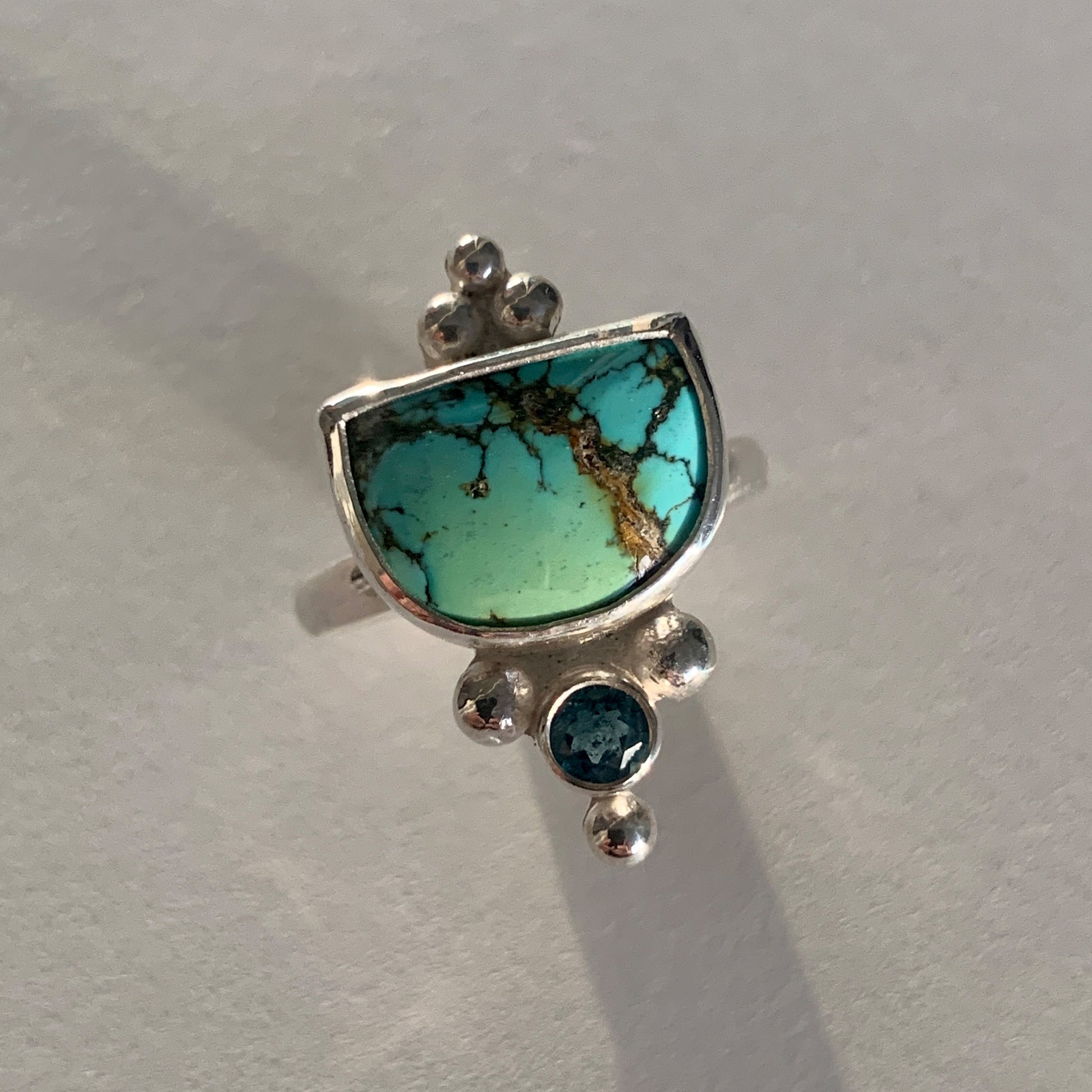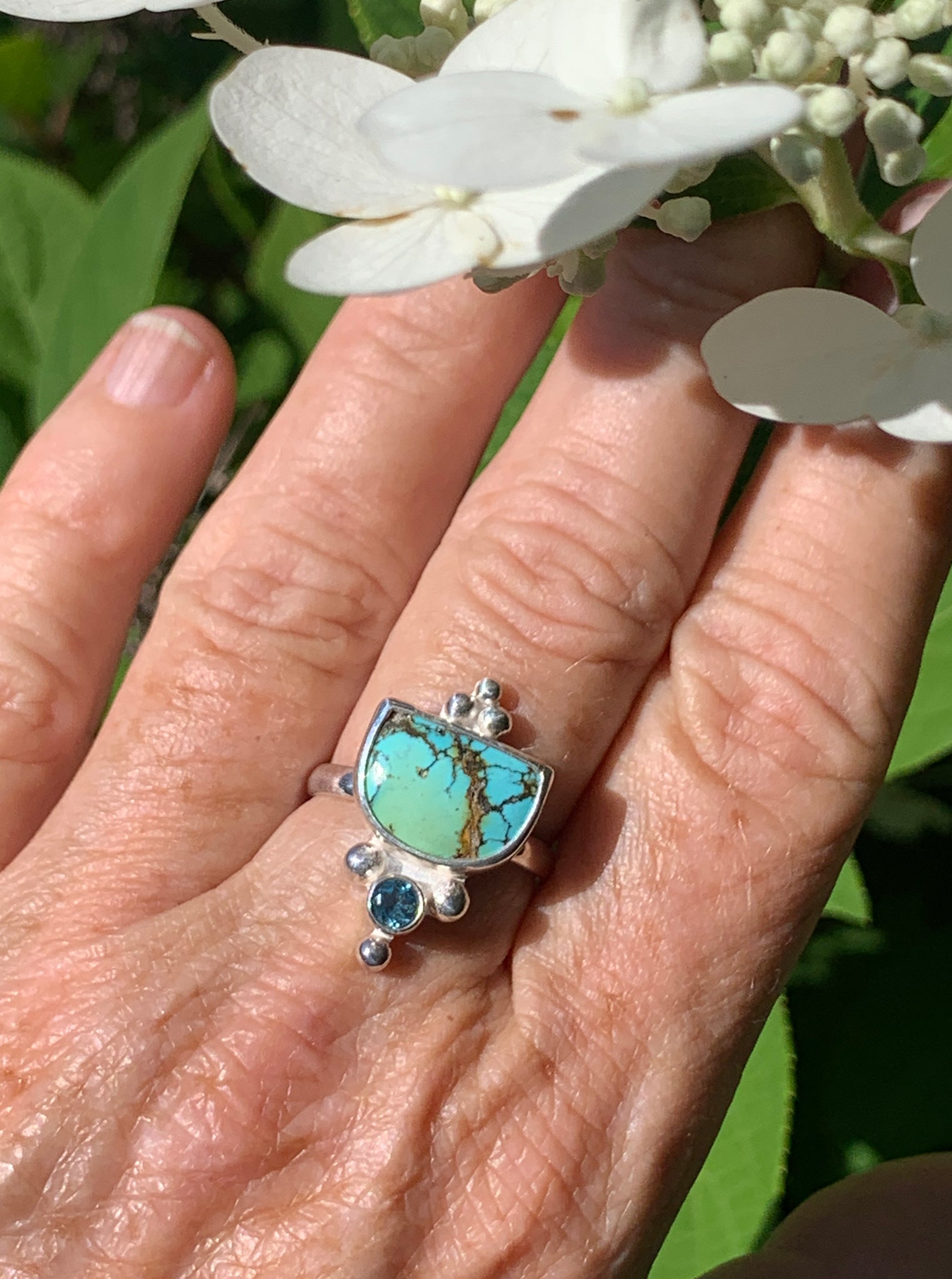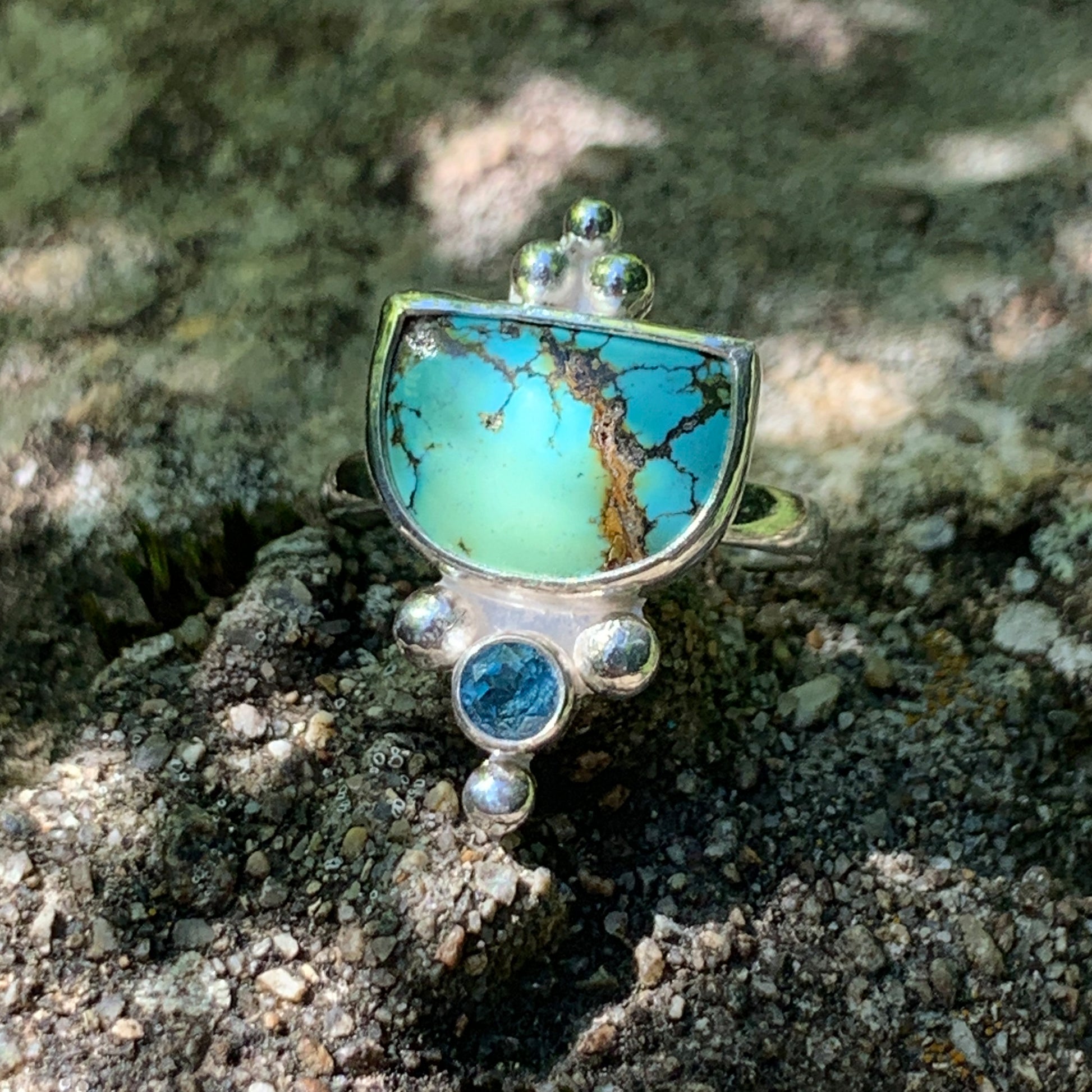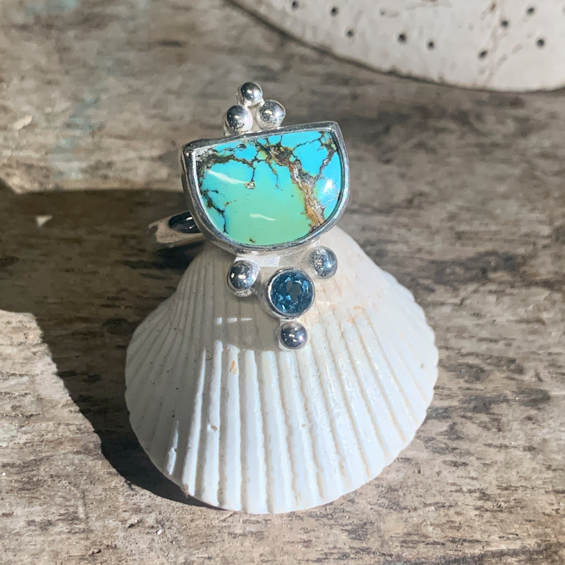 Hand fabricated, two stone, moderate statement ring featuring a stunning, half moon shaped Yungai Turquoise paired with a sparkly blue topaz with silver raindrops details.